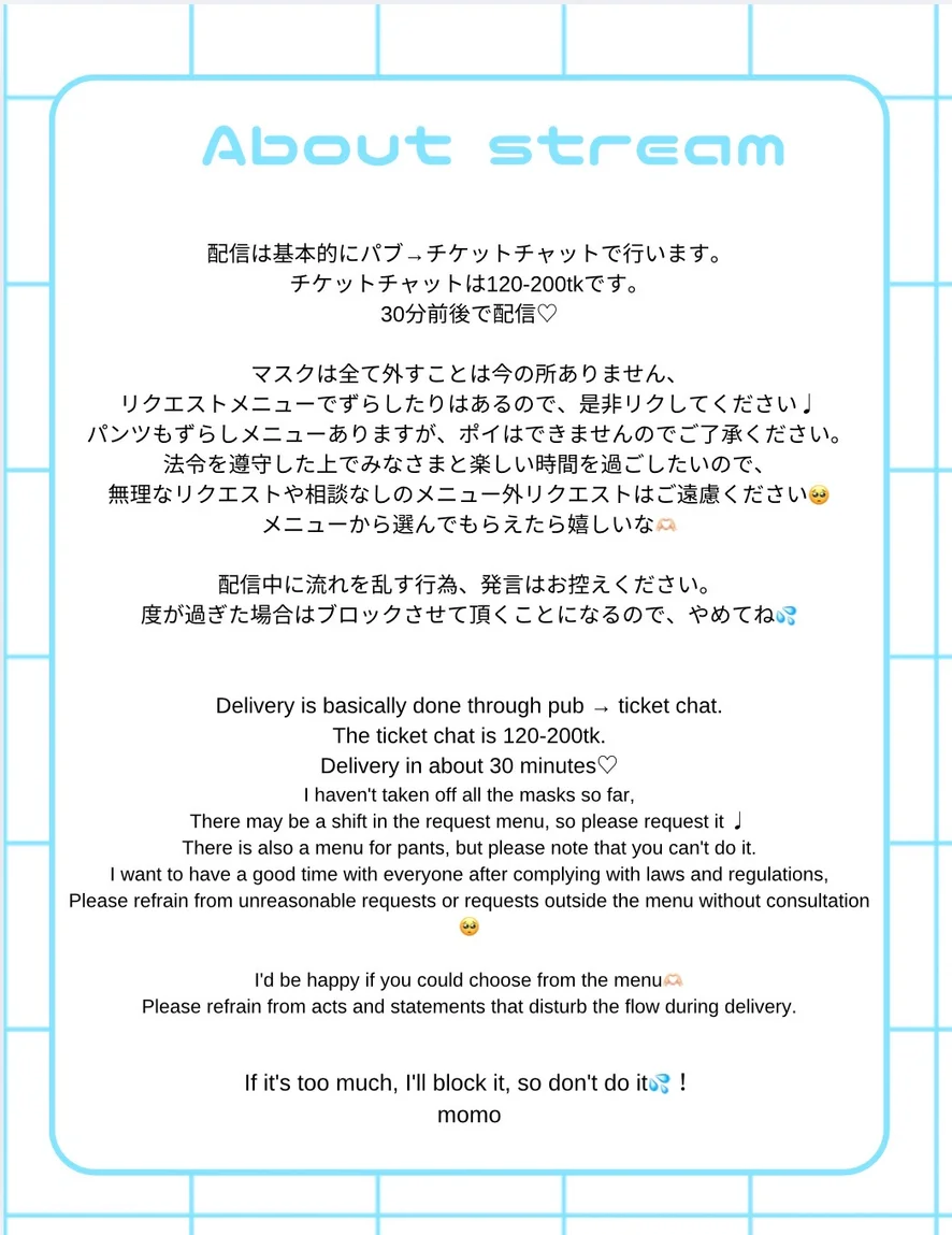 🤍法令を遵守した配信を行います。そのため性器を露出する行為はできません。 We will conduct distribution in compliance with laws and regulations. Therefore, acts involving the exposure of genitals are not permitted. 🤍法令違反のリクエストをされる方はブロックさせていただく場合があります。 We may block users who make requests that break the law. 🤍画像や動画の無断転載につきましては発覚次第、開示請求、損害賠償請求、刑事告訴をさせて頂きます。 Unauthorized reproduction of images or videos will result in disclosure requests, claims for damages, and criminal complaints upon discovery. 🤍ネット上であっても人と人とのコミュニケーションですので、見ている誰かが不快になるようなコメントはお控えください。 🎫返金対応について🎫 【チケチャでの注意事項】 チケットショーは経過 5分以降 または下着を脱いだ時点でチャット成立とさせていただきます。 成立後、回線が落ちてしまった場合は 返金対応できません。 チケットを購入する場合は自己責任でお願いします Ticket Chat Notice For ticket shows, chat will be considered established after 5 minutes have elapsed or when the person becomes completely naked. If the connection is lost after the establishment. refunds will not be possible. Please purchase tickets at your own risk.11:3411:34
